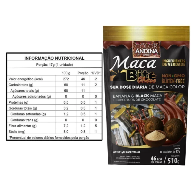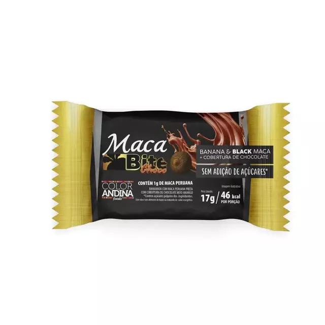 Garanta já a sua Maca bite - bananinha, canela, maca peruana vermelha Color Andina e cobertura de chocolate.