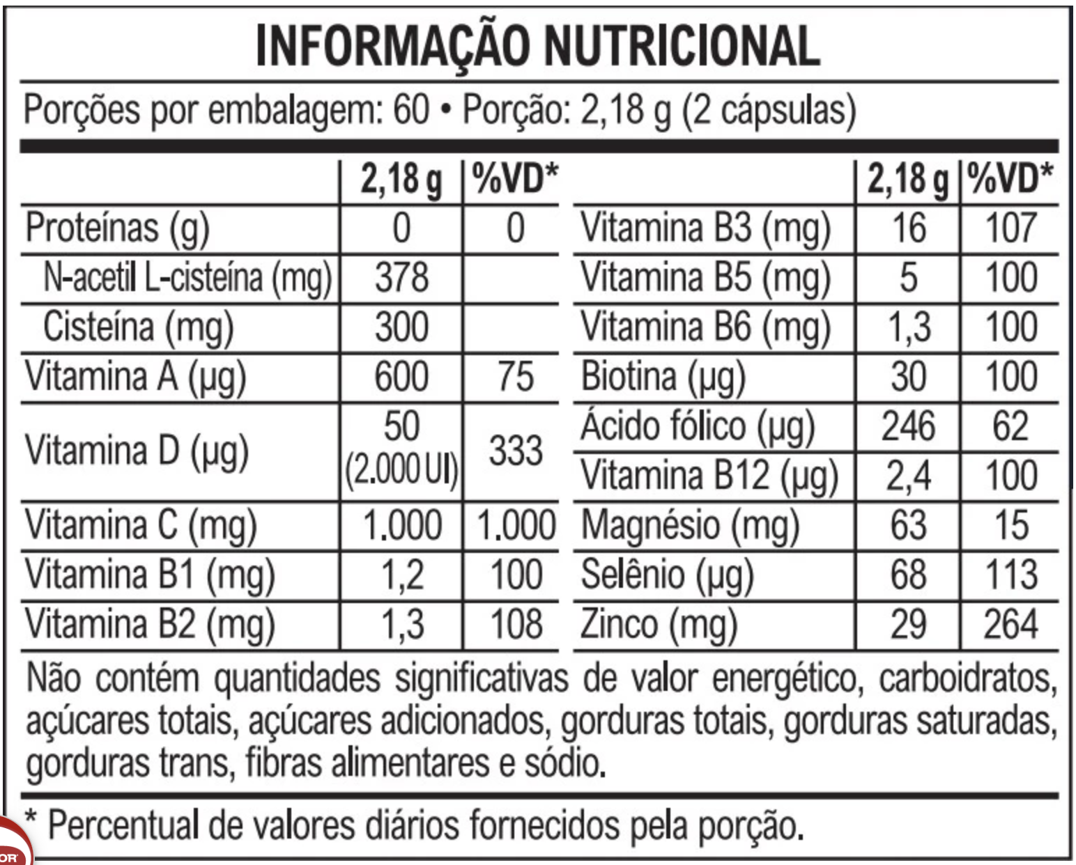 Ácido ascórbico (vitamina C), N-acetil L-cisteína, bisglicinato de magnésio (magnésio), bisglicinato de zinco (zinco), levedura enriquecida com selênio (selênio), colecalciferol (vitamina D), niacinamida (vitamina B3), D-pantotenato de cálcio (vitamina B5), acetato de retinol (vitamina A), cloridrato de piridoxina (vitamina B6), riboflavina (vitamina B2), cloridrato de tiamina (vitamina B1), ácido fólico (vitamina B9), metilcobalamina (vitamina B12), D-biotina (vitamina B7) e antiumectantes estearato de magnésio e dióxido de silício. Composição da cápsula: hidroxipropilmetilcelulose (HPMC), água purificada, opacificador (corante carbonato de cálcio e amido modificado), gelificante carragena e regulador de acidez acetato de potássio.