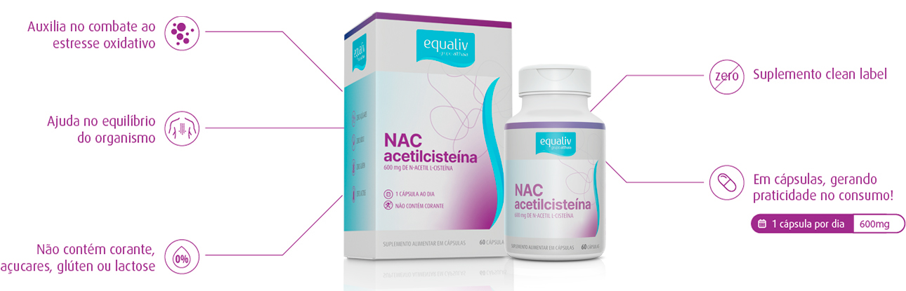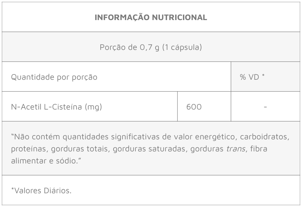 Acetilcisteína, amido de milho, (estabilizante) croscarmelose sódica, (antiumectante) dióxido de silício, (lubrificante) estearato de magnésio e cápsula vegetal derivada da celulose.
