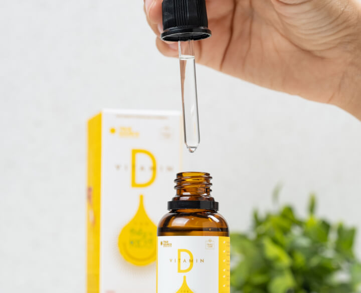A Vitamina D da True Source fornece 5mcg por gota com sabor natural.